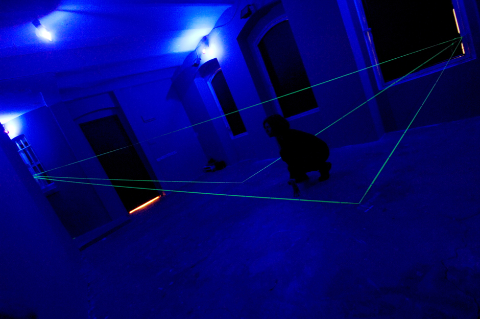 “Temporary Space” was a continuously changing installation instead of a static form installed in space. At the opening time, two different length of elastic bands were stretched with hooks in the space. In this performance, accompanied by music and body movements, many spatial works were performed at the moment in front of the viewers. During the exhibition, it was continued to create different spatial works with the viewer. Thus, the installation was transformed with various moves within the possible conditions of the space.